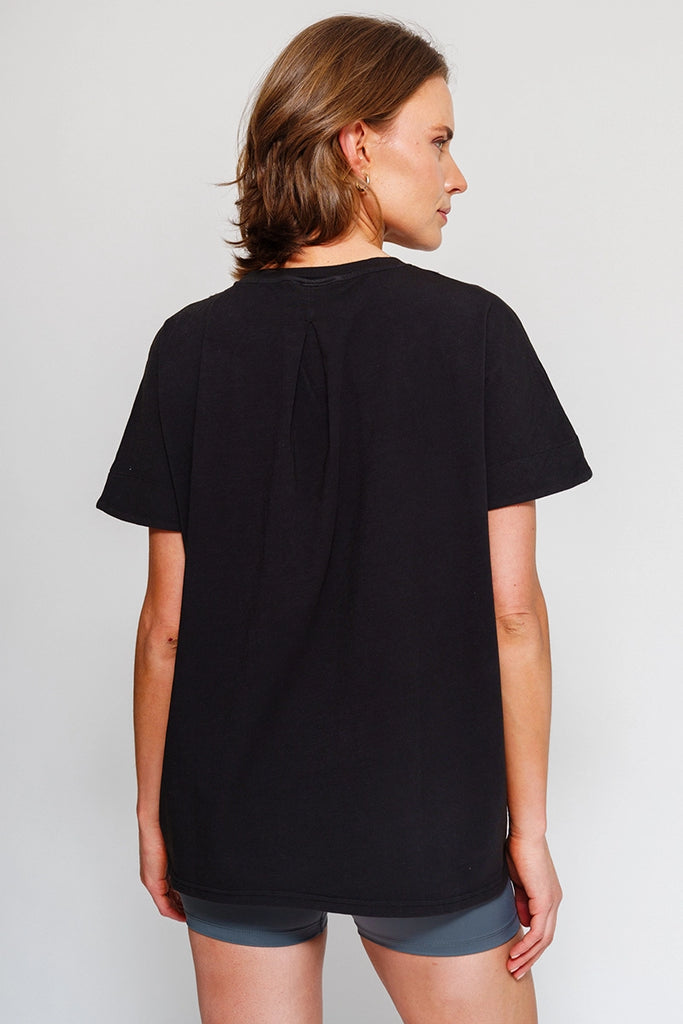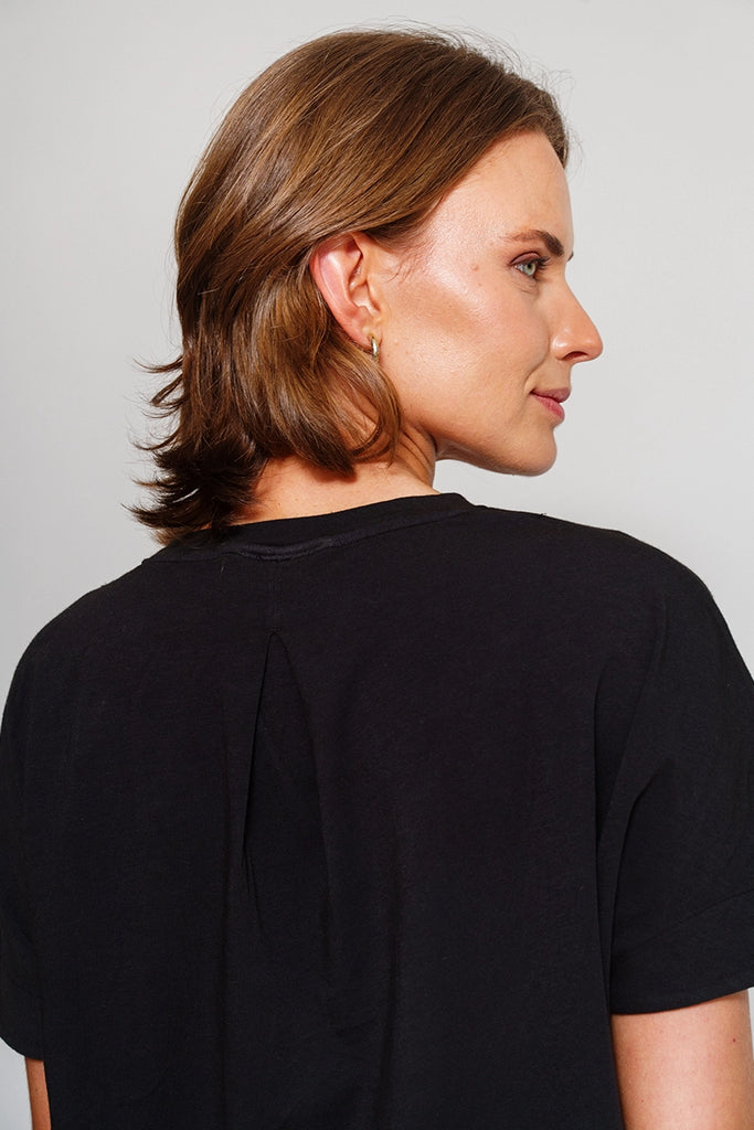 Fabricada con algodón Pima, presenta un corte slouchy oversized (holgado y extragrande) que cae con elegancia. Las mangas cortas estilo capa y un pliegue posterior. Modelo usa talla S.